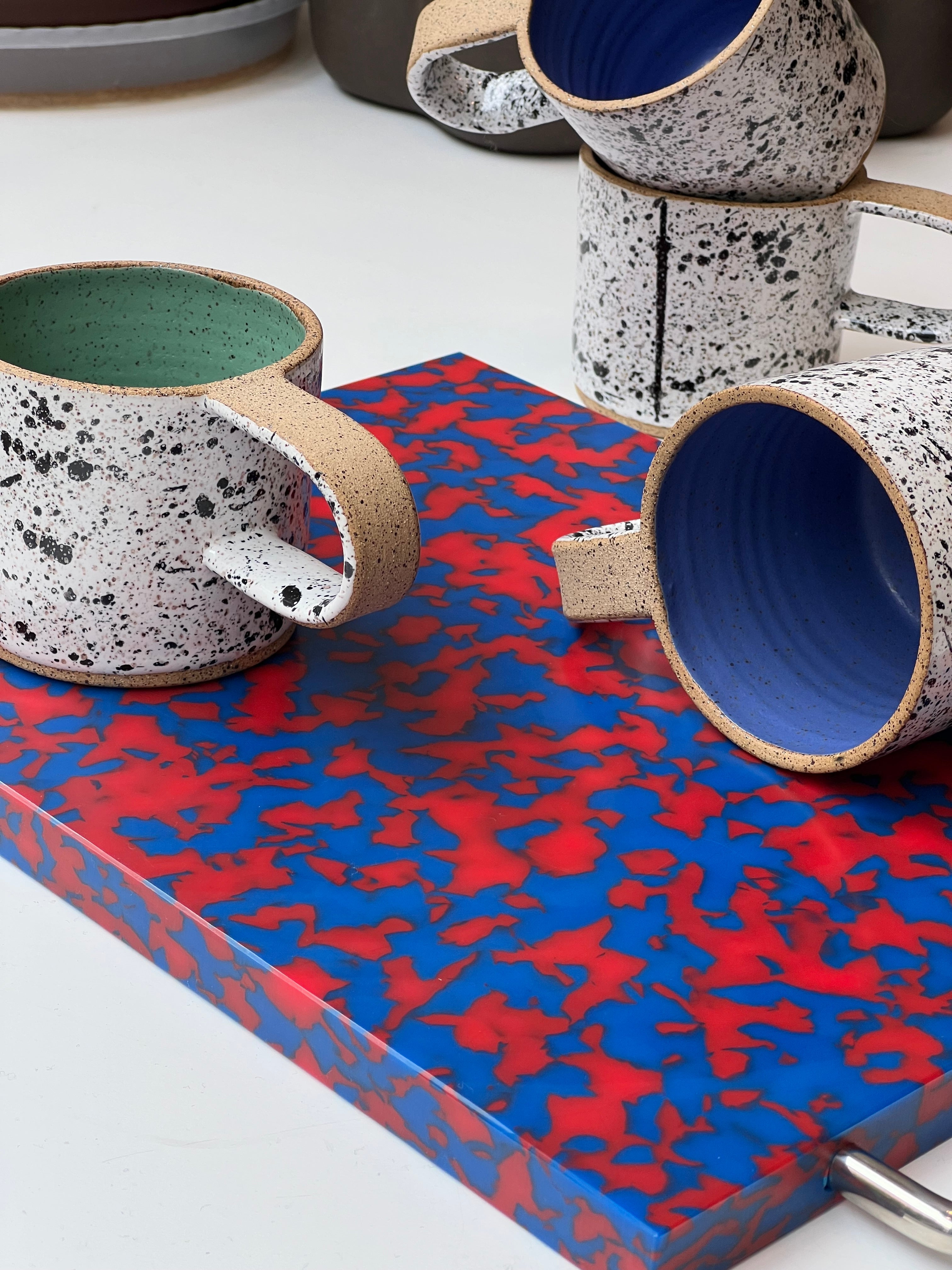 Wheel thrown mug with a flat ribbon handle. The outside is glazed with a glossy white glaze and black speckles. Inside glazed with a sage glossy glaze. Say hello to your new favorite mug!