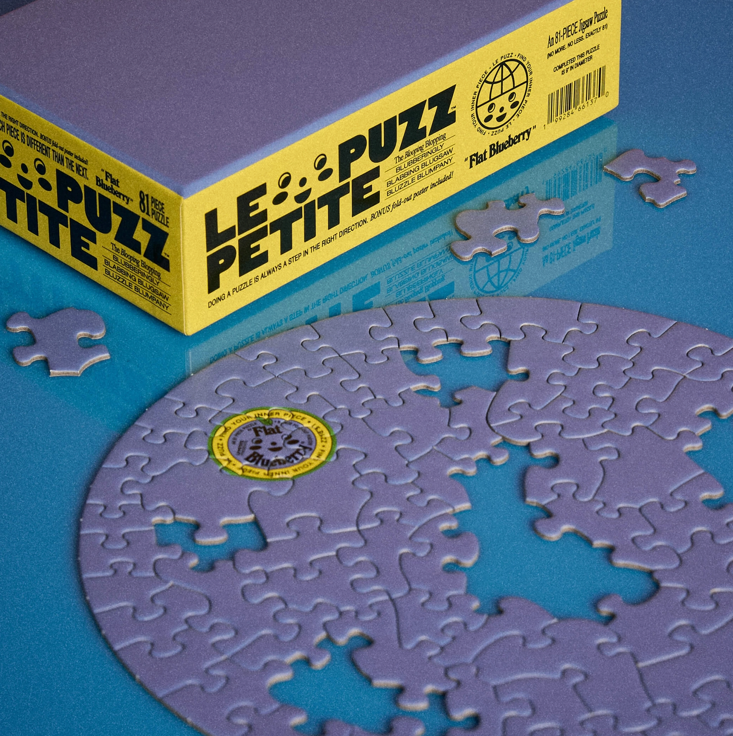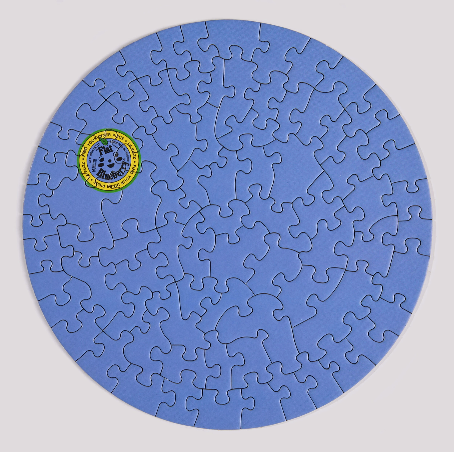 A miniature, round, solid-blue, 81-piece jigsaw puzzle that's as flat as a blueberry ... as they say!