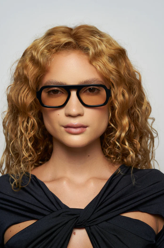 These sunglasses have a black acetate frame and subtle light brown tinted lenses with UV400, UVB, and UVA Protection.