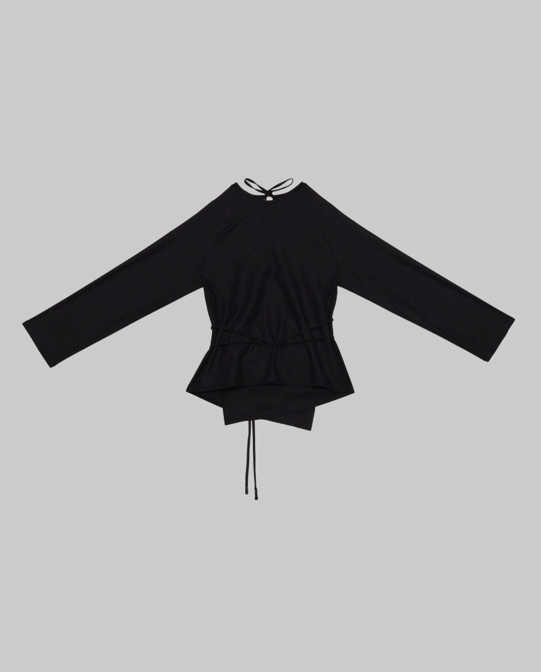 This refined wild silk wrap top in black showcases an open back, elegantly secured with ties at the neck and waist for a personalized fit. The raglan sleeves provide graceful movement and a sleek silhouette, making it an impeccable choice for stylish day or evening occasions.