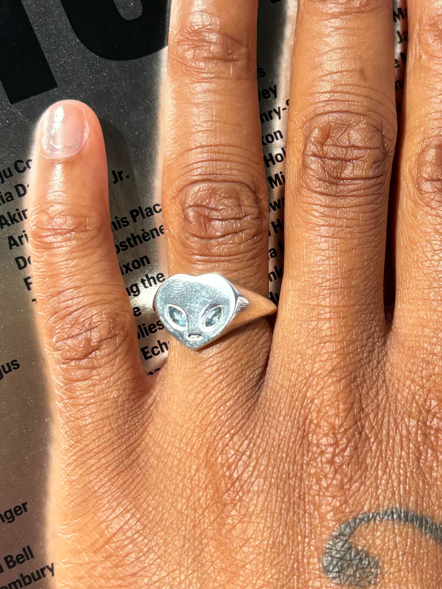 This alien ring has cosmic eyes to simultaneously see past present and future. Made of sterling silver with black star sapphire eyes, this is such a playful yet gorgeous piece to add to your everyday jewelry rotation!