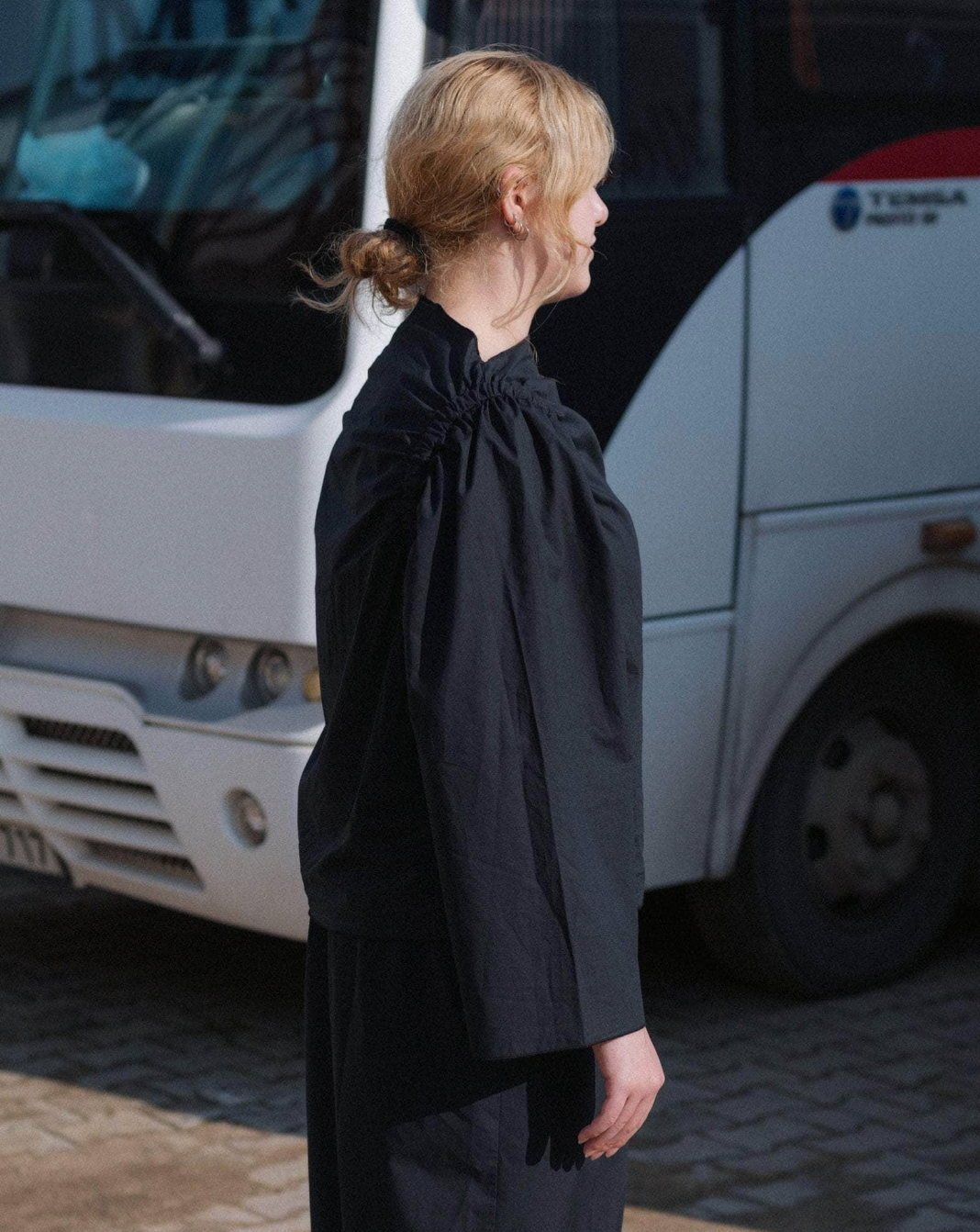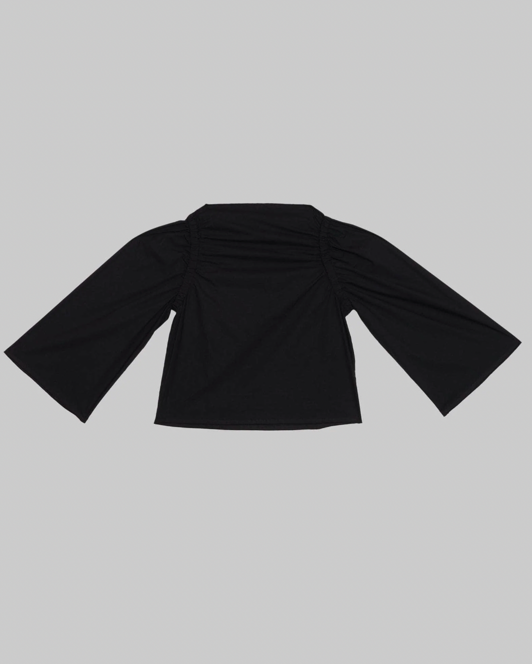 Crafted from organic cotton poplin, the Simmon Top in Black features a refined boat neck and delicate elastic gathers at the armholes, creating an elegant silhouette.